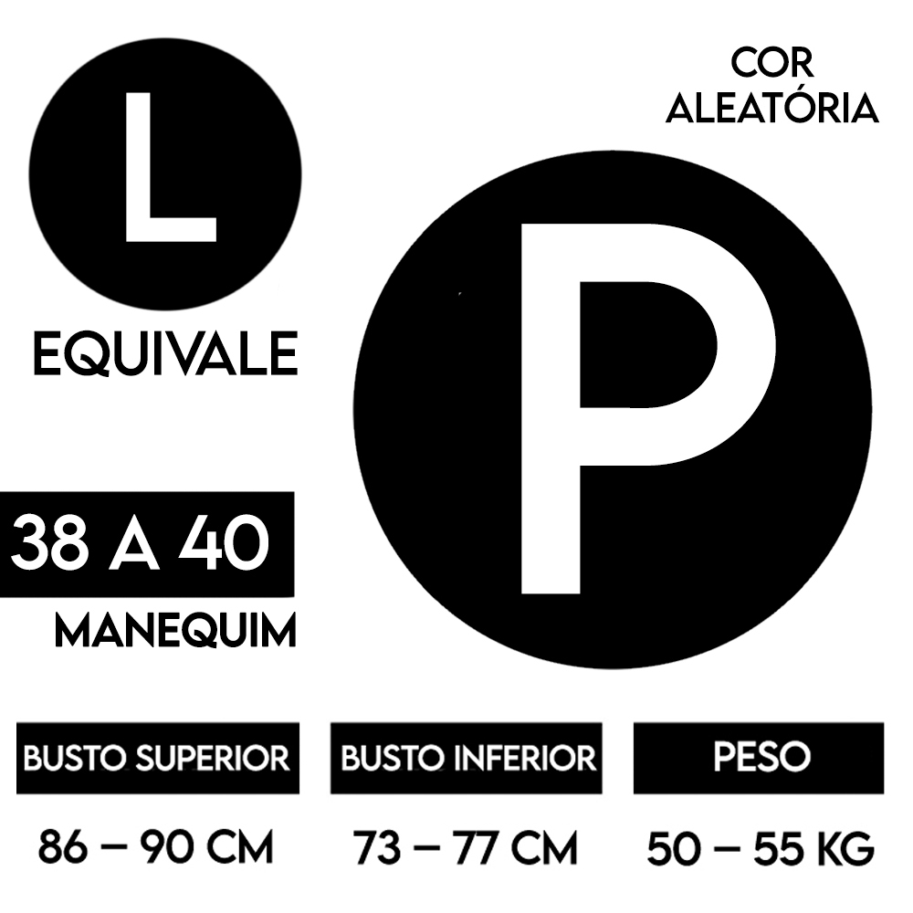GG: Busto Superior: 91 a 95 cm | Busto Inferior: 78 a 82 cm | Peso: 55kg - 60kg